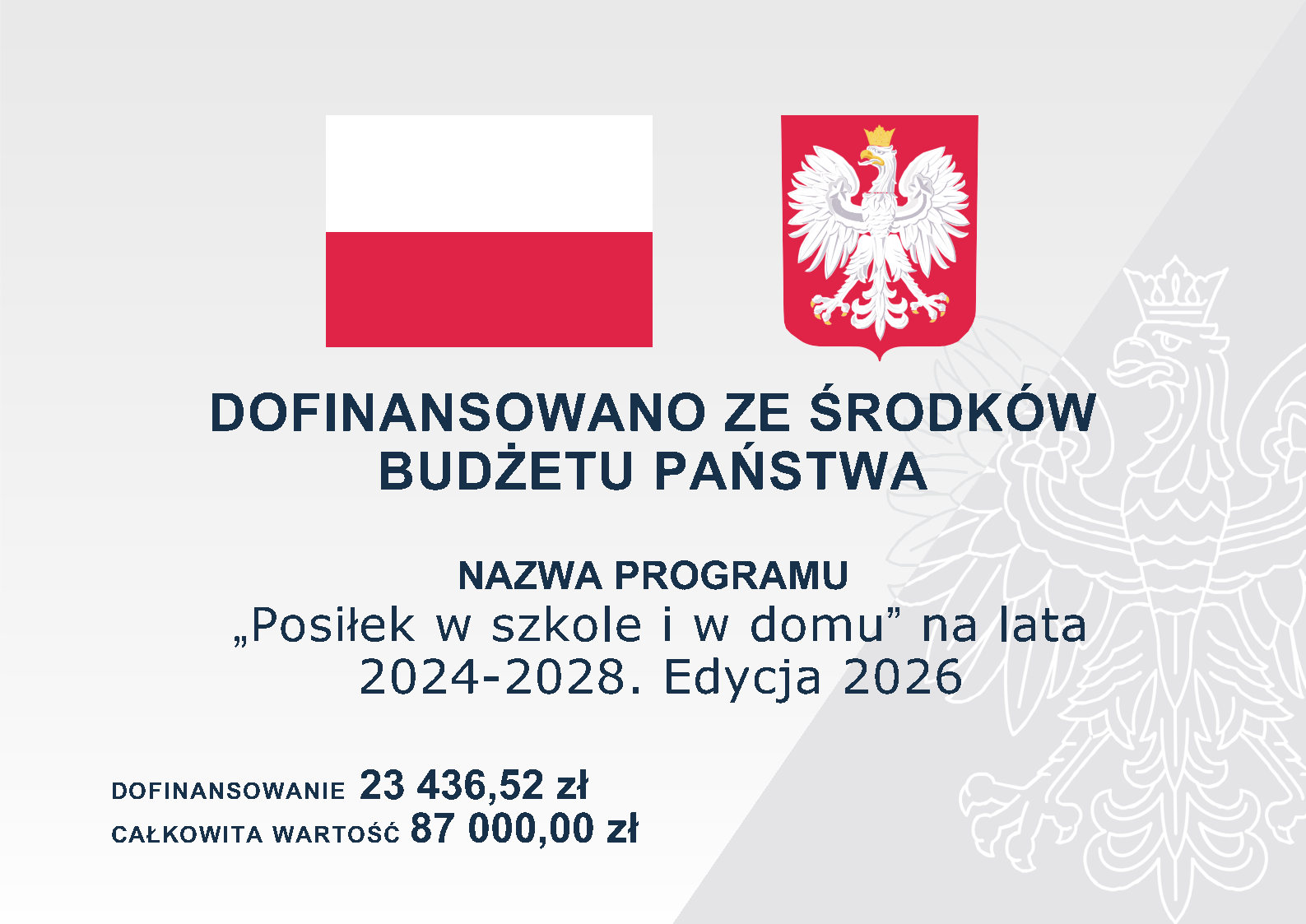 Przewidywany łączny koszt realizacji zadania „Posiłek w szkole i w domu” na lata 2014 – 2028” w 2026 r. wynosi 87 000,00 zł.